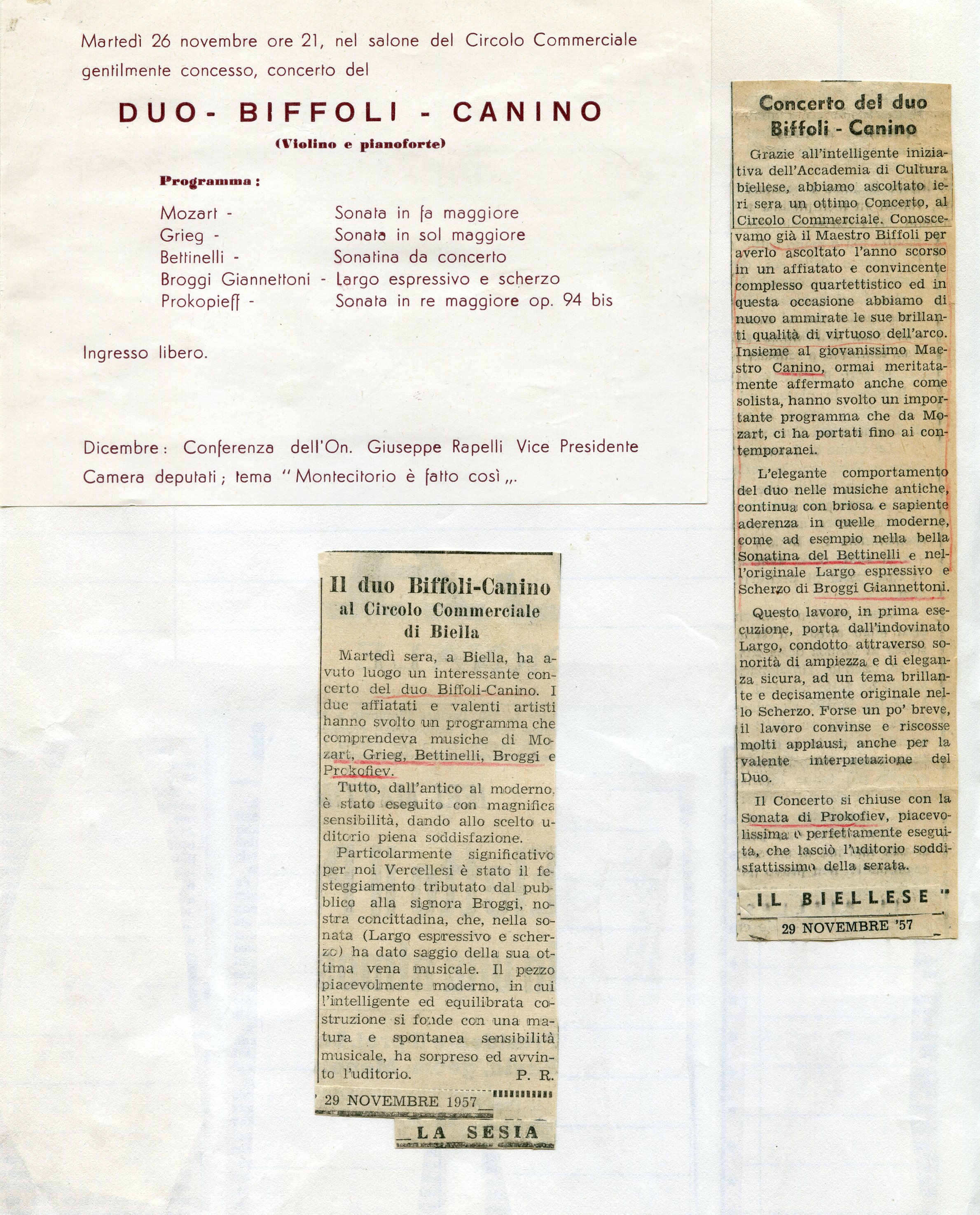 img022 Publicato 12 settembre 2015 alle 2379 × 2950 li BIOGRAFIA PER IMMAGINI ← Precedenti Successivi → Ben affiatato il Duo Biffoli-Canino nell’esecuzione di brani di Mozart, Grieg, Bettinelli, Broggi Giannettoni e Prockofiev. Biella 1957.