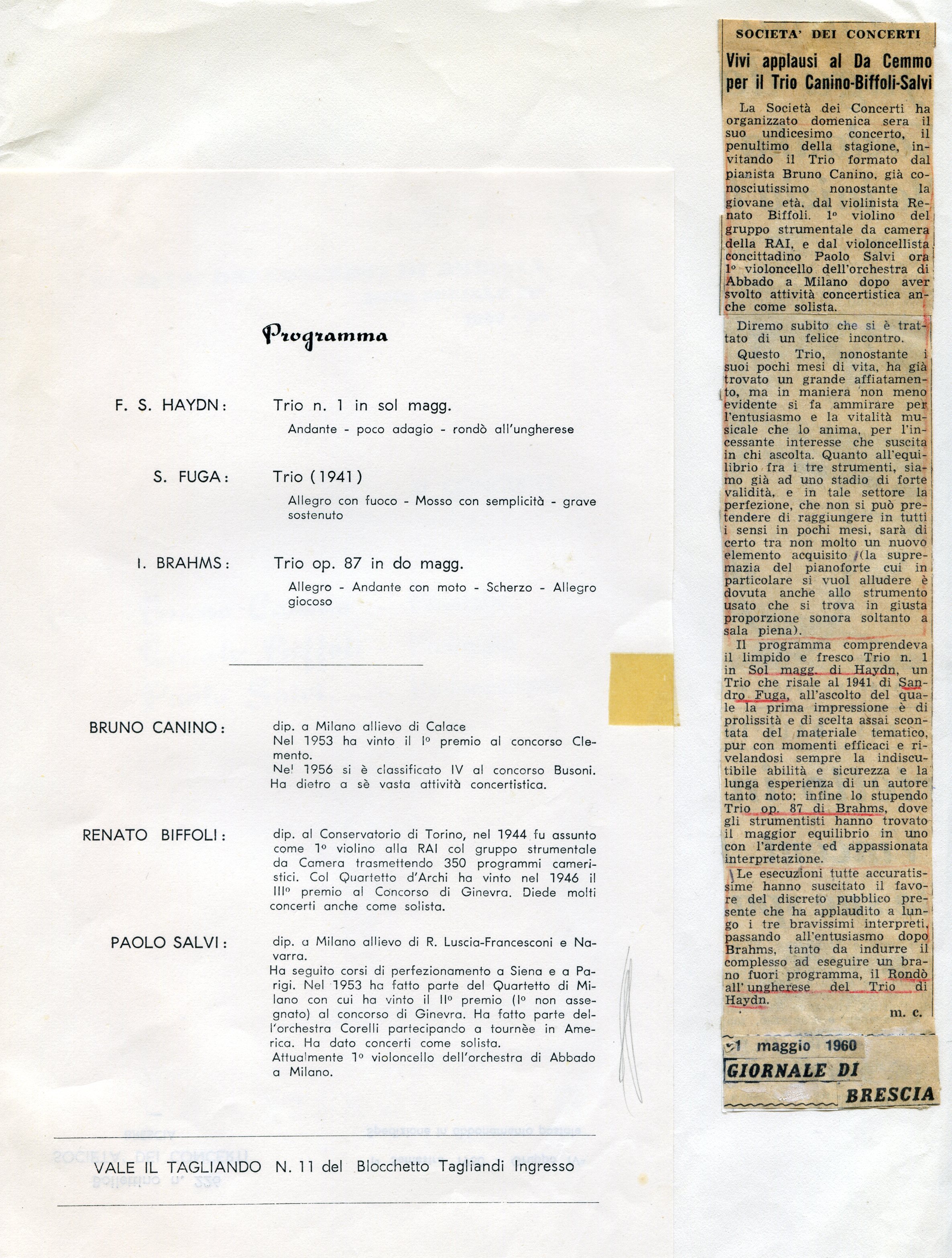 Maggio 1960. La Società dei Concerti di Brescia invita Renato Biffoli, Bruno Canino e Paolo Salvi, 1° violoncello nell’Orchestra di Claudio Abbado a Milano per il suo undicesimo concerto. Le accuratissime esecuzioni delle musiche in programma F.S. Haydn, S. Fuga e J. Brahms hanno entusiasmato il pubblico che ha chiesto ed ottenuto un brano di Haydn fuori programma.