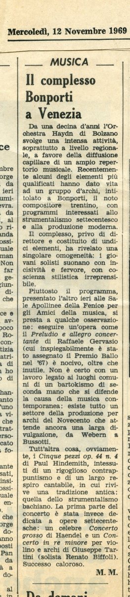 Il Complesso Bonporti a Venezia. Ha dato prova di omogeneità, fervore e coscenza stilistica irreprensibile. Piuttosto il programma, presentato l’altro ieri alle Sale Apollinee della Fenice per gli Amici della musica [….] Non è certo con un lavoro legato ai luoghi comuni di un bartokismo di seconda mano che si difende la causa della musica contemporanea […] M.M. 12 Novembre 1969