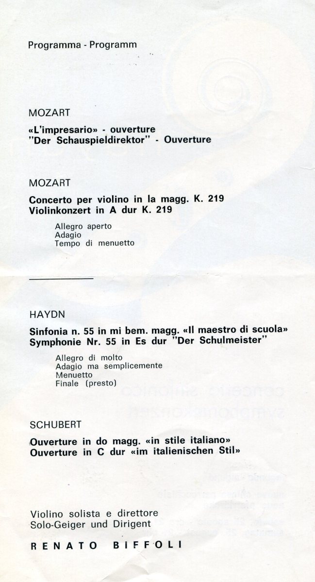 img058 Publicato 12 settembre 2015 alle 1315 × 2431 li BIOGRAFIA PER IMMAGINI ← Precedenti Successivi → Mozart, Haydn e Schubert in “stile italiano”. Violino solista e Direttore Renato Biffoli.