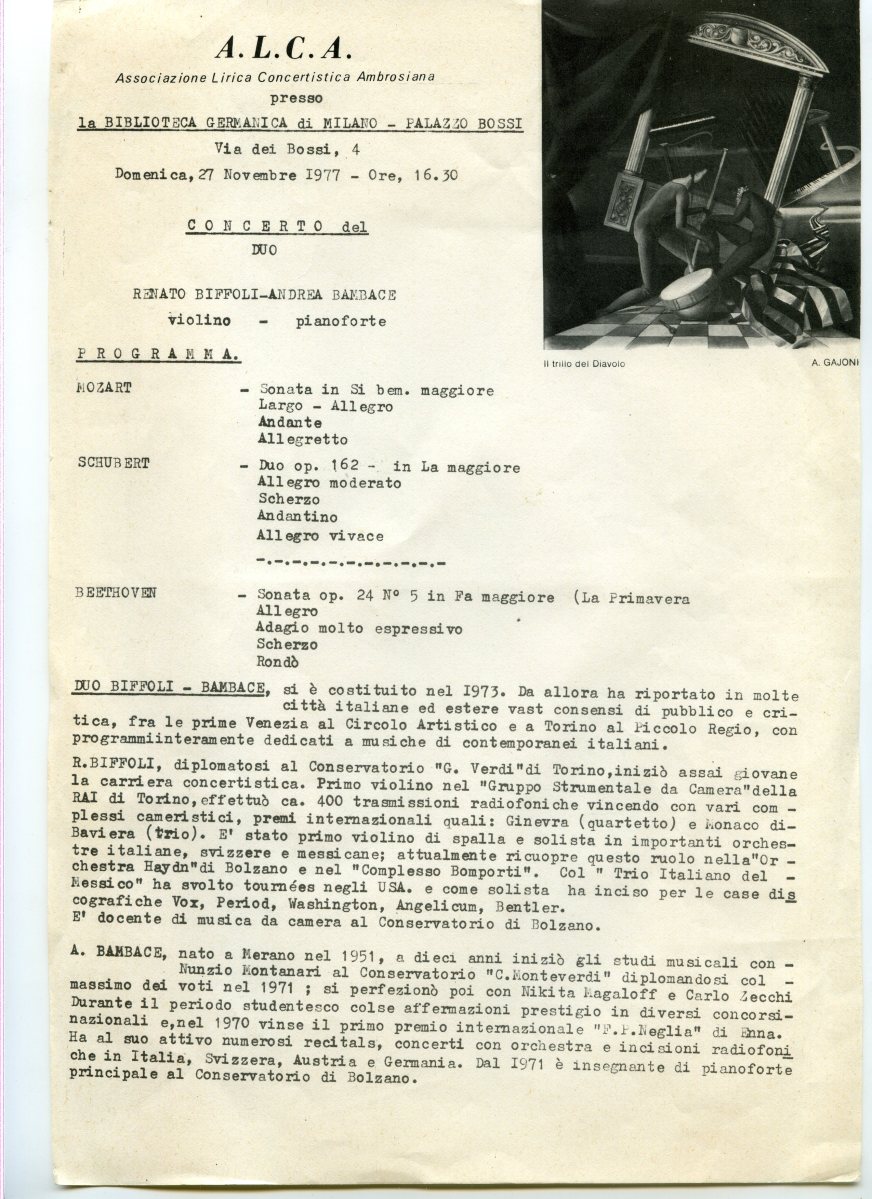 img068 Publicato 12 settembre 2015 alle 2550 × 3509 li BIOGRAFIA PER IMMAGINI ← Precedenti Successivi → Presso la Biblioteca Germanica di Milano il Duo Biffoli-Bambace ha eseguito musiche di Mozart, Schubert e beethoven. 27 Novembre 1977.