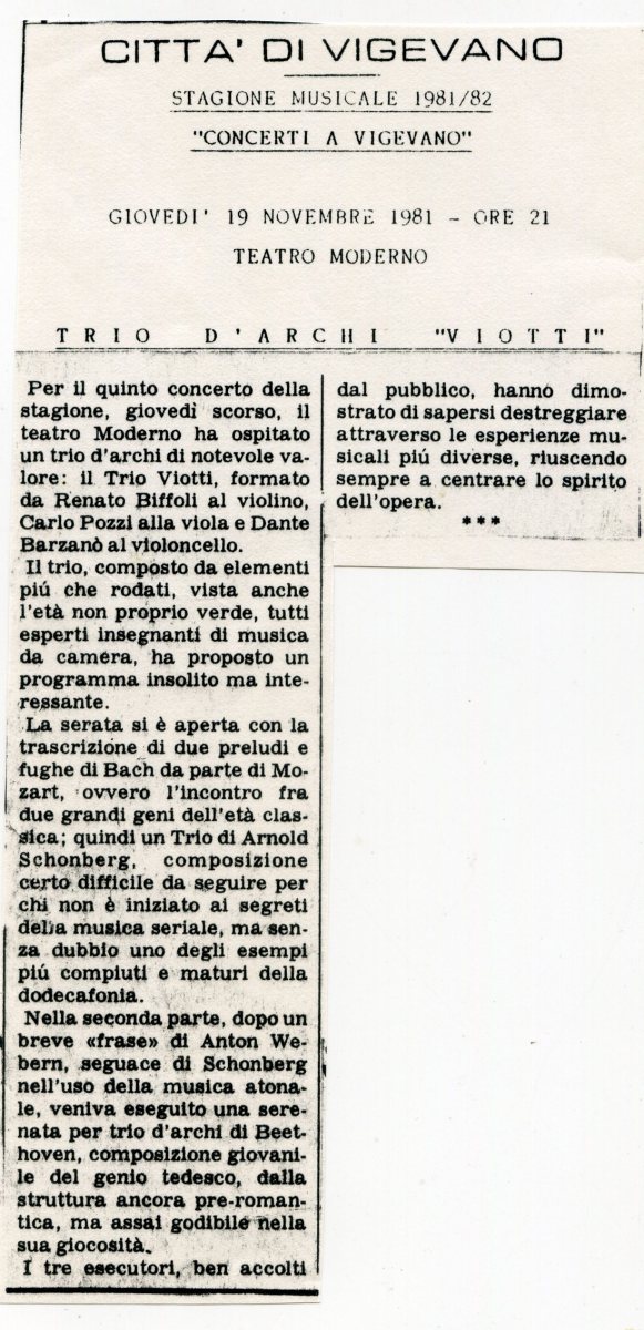 Nel Teatro Moderno di Vigevano il Trio Viotti: Biffoli (violino), Dante Barzanò (violoncello) e Carlo Pozzi (viola) ha proposto un programma insolito ma interessante. Fra brani di Bach, Mozart, Webern e Beethoven, è doveroso sottolineare il “Trio di Arnold Schonberg, difficile da esguire per chi non è iniziato ai segreti della musica seriale, ma senza dubbio uno degli esempi più compiuti e maturi della dodecafonia. 19 Novembre 1981