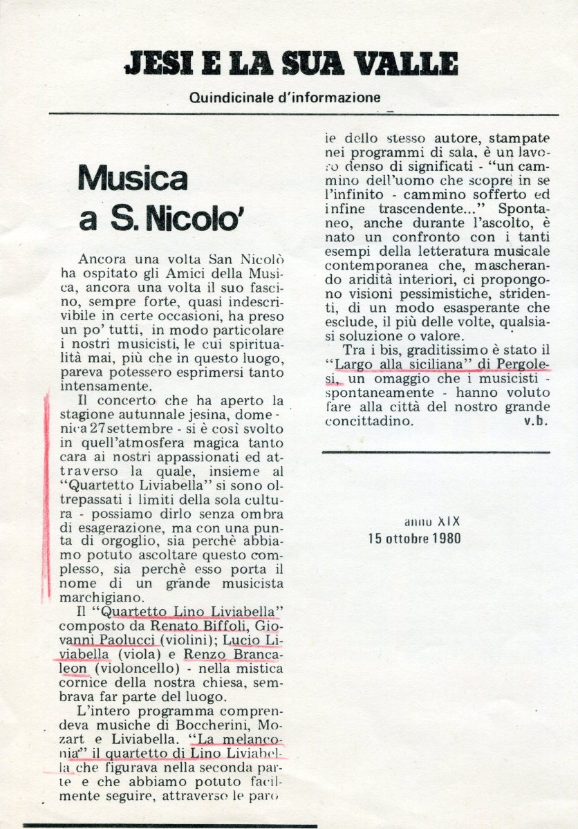 img077 Publicato 12 settembre 2015 alle 1684 × 2417 li BIOGRAFIA PER IMMAGINI ← Precedenti Successivi → Oltre alle musiche di Boccherini e Mozart, il Quartetto Liviabella, ha eseguito il quartetto per archi dello stesso L. Liviabella “La melanconia”, composto nel 1955. Jesi e la sua Valle, quindicinale d’Informazione, 15 Ottobre 1980.