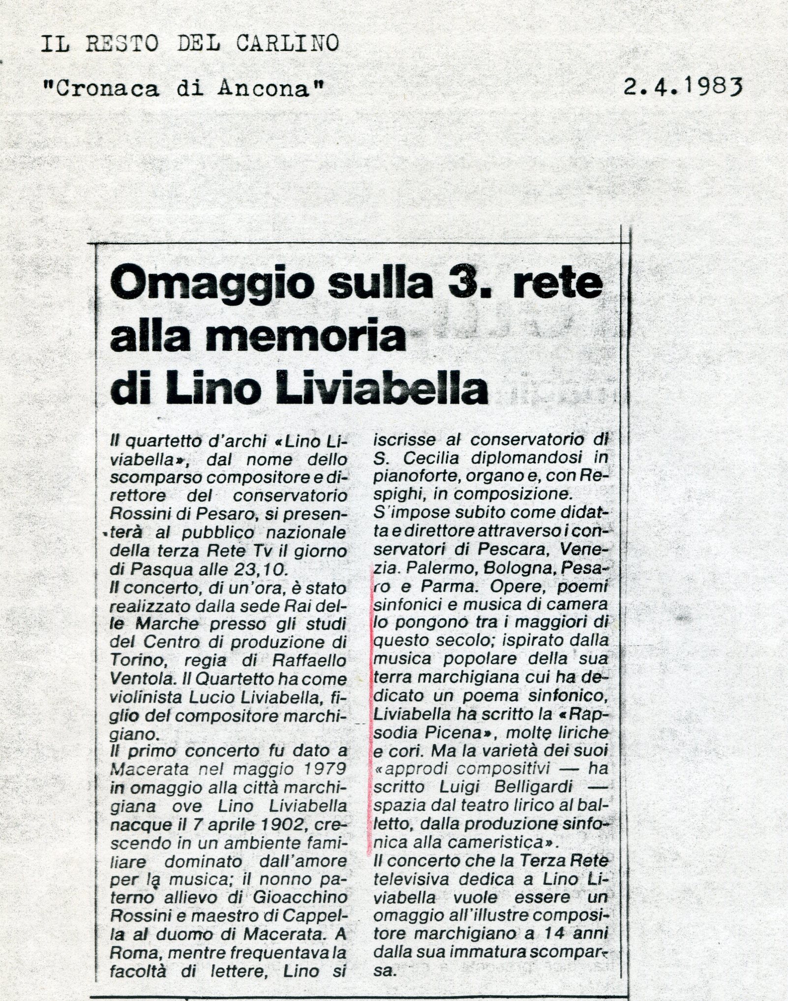 Lino Liviabella si diplomò in pianoforte , organo, ed in composizione con Respighi, presso il Conservatorio di Santa Cecilia. Le sue composizioni spaziano dal teatro lirico al balletto, dalla produzione sinfonica alla cameristica. Un omaggio da Rai Tre a quattordici anni dalla sua prematura scomparsa. Il Resto del Carlino 2 Aprile 1983