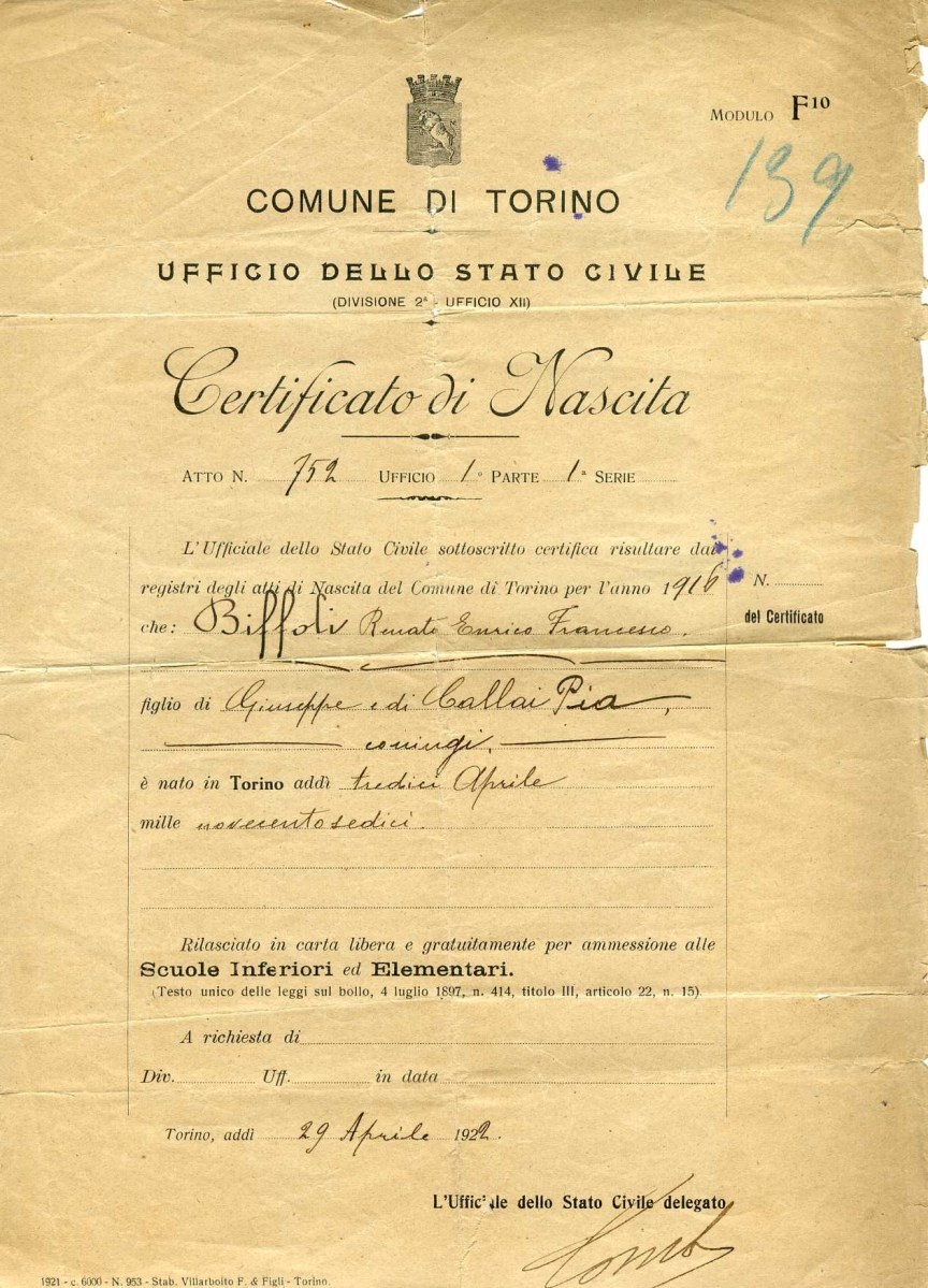 Certificato di nascita Published 9 agosto 2014 at 1262 × 1752 Certificato di nascita rilasciato dal Comune di Torino ad uso scolastico. Certificato di nascita dello Regno Sabaudo