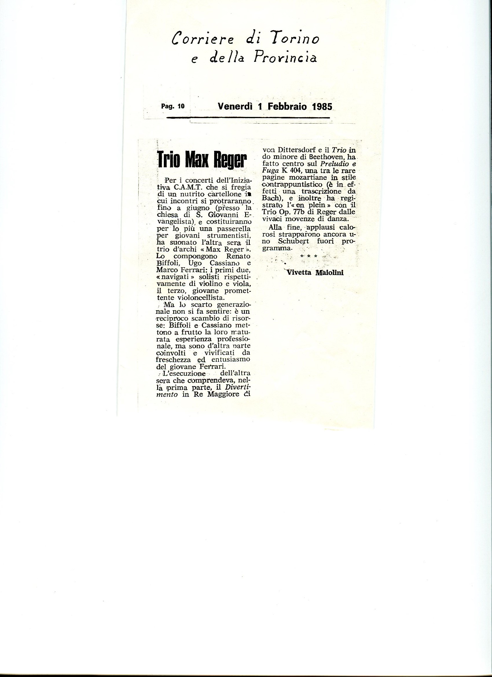 […] è un reciproco scambio di risorse: Biffoli e Cassiano mettono a frutto la loro maturata esperienza professionale, ma sono d’altra parte coinvolti e vivificati da freschezza ed entusiasmo del giovane Ferrari. Vivetta Maiolini – Corriere di Torino e della Provincia, 1° Febbraio 1985.