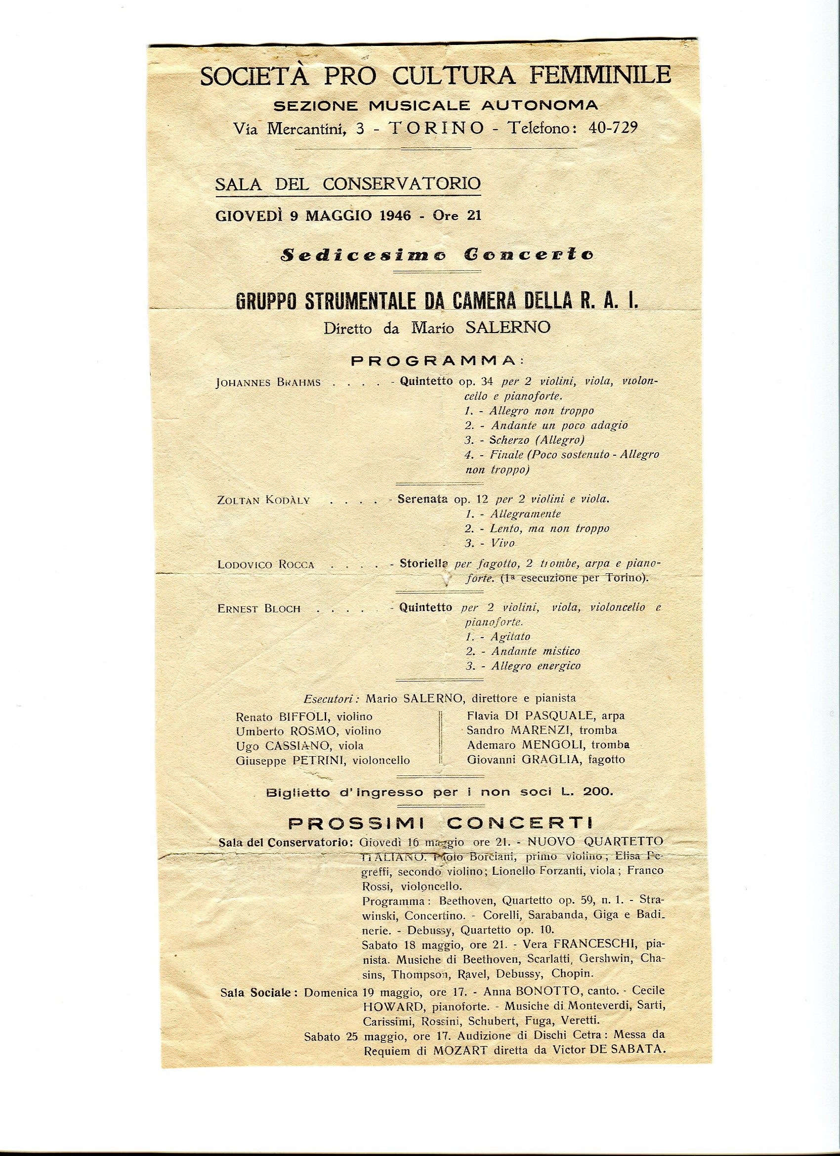 img111 Published 5 luglio 2014 at 1700 × 2339 Gruppo Strumentale della RAI diretto da Mario Salerno per la Società Pro Cultura Femminile al Conervatorio. Musiche di Z. Kodàly, J: Brahms,, Ludovico Rocca ed Ernest Bloch. Torino, 9 Maggio 1946.