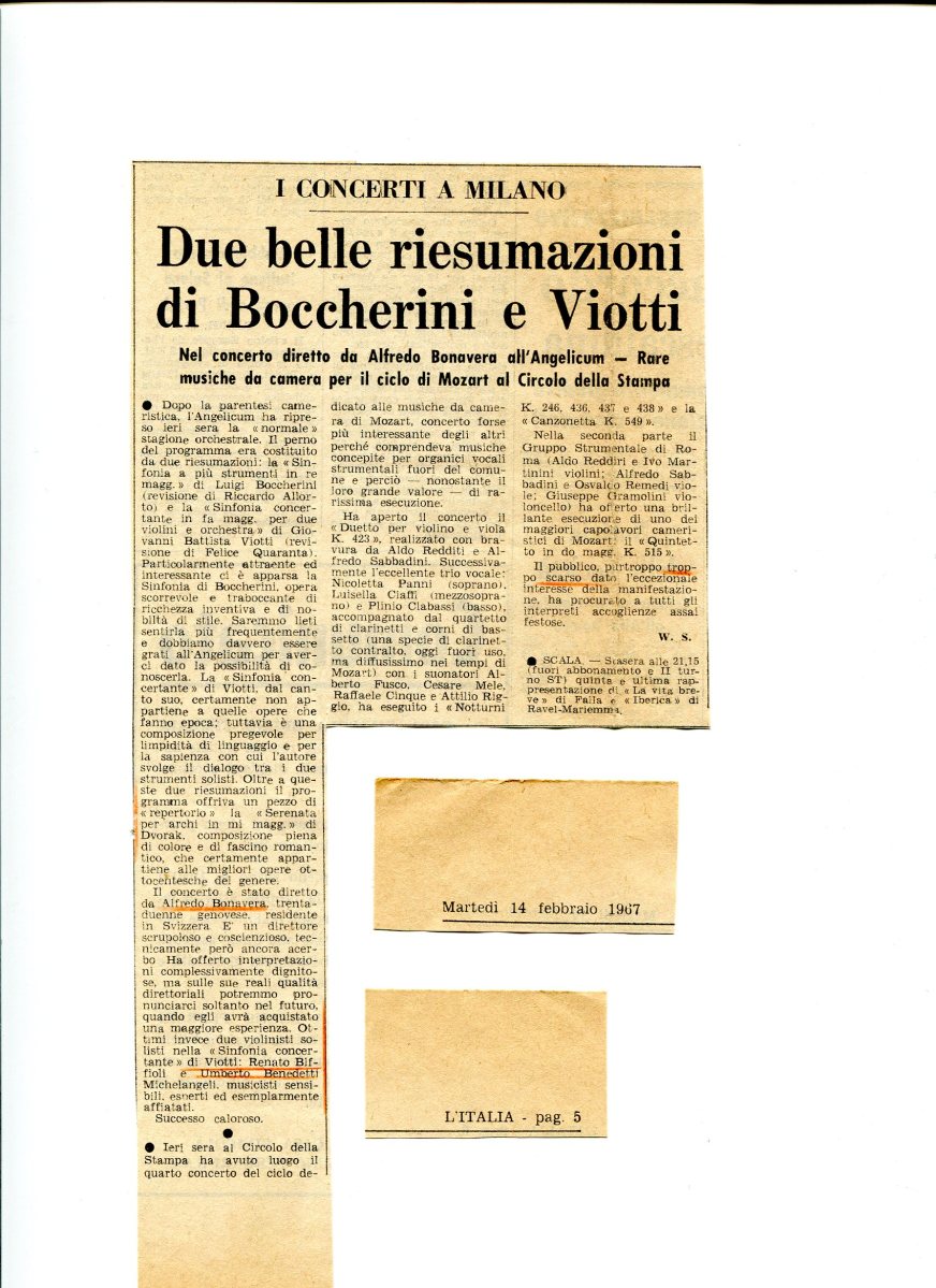 Dopo la paentesi cameristica l’ Orchestra dell’Angelicum riprende la stagione orchestrale con musiche di Boccherini, Viotti e Dvorak. Il Concerto è stato diretto dal giovane genovese Alfredo Bonavera. 14 Febbraio 1967.