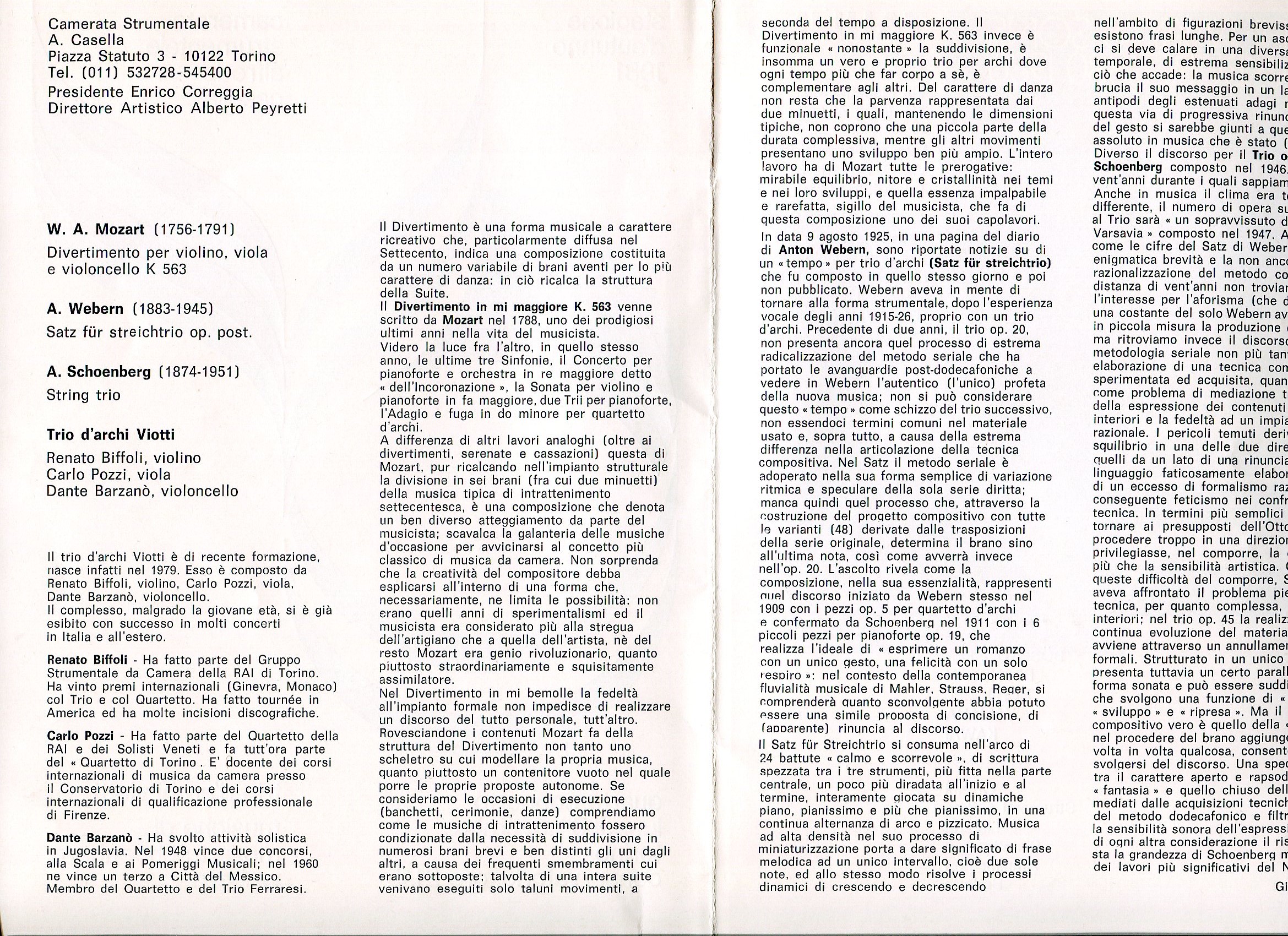 Il Trio Viotti suona alla Camerata Strumentale “Alfredo Casella”. Si inizia con un Divertimento che è una forma musicale a carattere ricreativo che, particolarmente diffusa nel Settecento, indica una composizione costituita da un numero variabile di brani, aventi per lo più carattere di danza: in ciò ricalca la struttura della Suite.