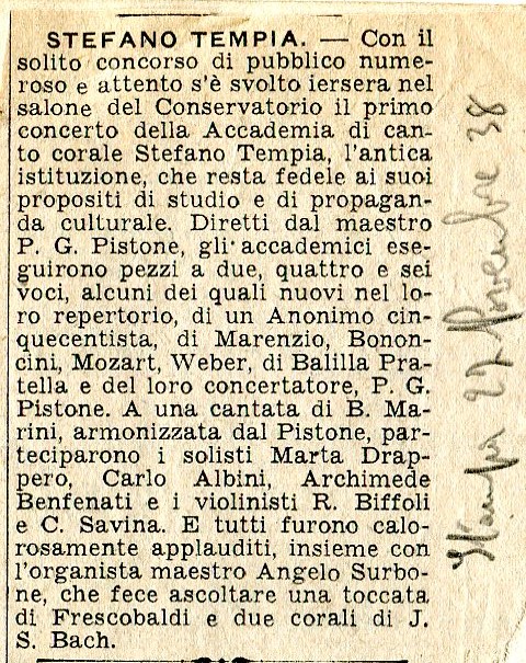 img159 Published 5 luglio 2014 at 480 × 605 Brani di Mozart, Weber, Balilla Pratella eseguiti a due, quattro, sei voci dagli Accademici della storica Corale Stefano Tempia nel salone del Conservatorio. La Stampa di Torino, 27 Novembre 1938.