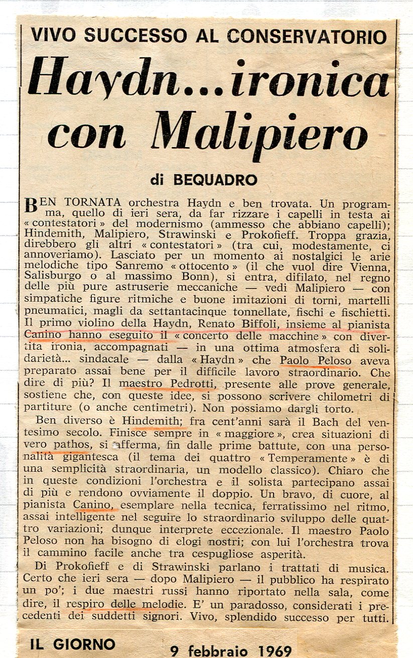 …”Con simpatiche figure ritmiche e buone imitazioni di torni, martelli pneumatici, magli da settantacinque tonnellate, fischi e fischietti. Il primo violino della Haydn, Renato Biffoli, ed il pianista Bruno Canino, hanno eseguito il concerto delle macchine con divertita ironia, accompagnati dall’Orchestra Haydn che Paolo Peloso aveva preparato assai bene per il difficile lavoro straordinario.”… (Bequadro – Il Giorno, 9 Febbraio 1969).