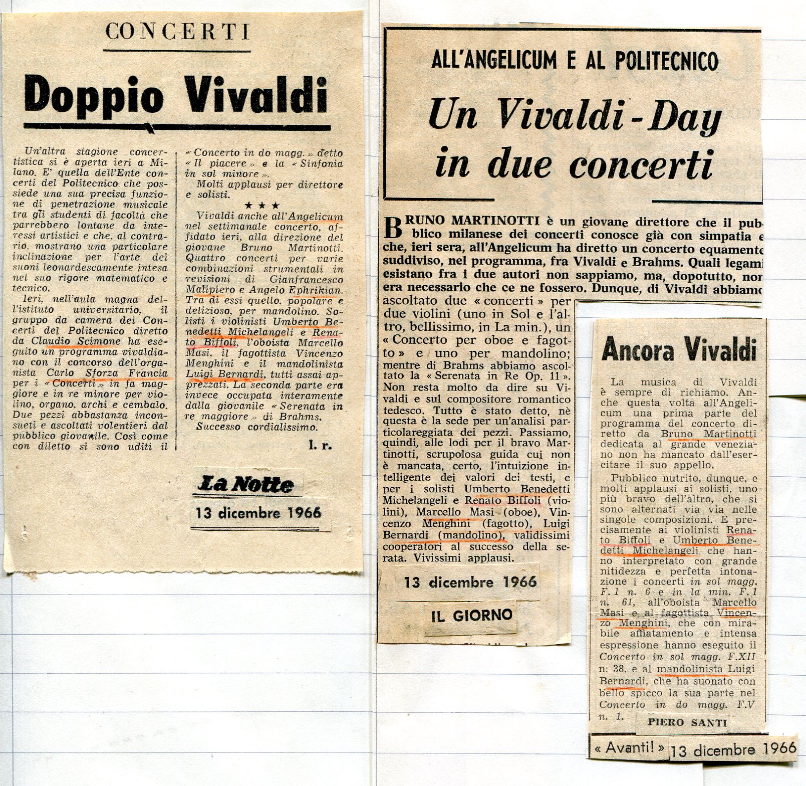 La musica di Vivaldi è sempre un richiamo. All’Angelicum pubblico nutrito, dunque e molti applausi al giovane Direttore Bruno Martinotti e ai solisti uno più bravo dell’altro che si sono alternati via via nelle singole composizioni. Renato Biffoli ed Umberto Benedetti Michelangeli al violino, Marcello Masi all’oboe, Vincenzo Menghini al fagotto e Luigi Bernardi al mandolino che con bello spicco ha suonato la sua parte nel Concerto in Do Maggiore F.V. n.1 – Piero Santi, L’Avanti del 13 Dicembre 1966.