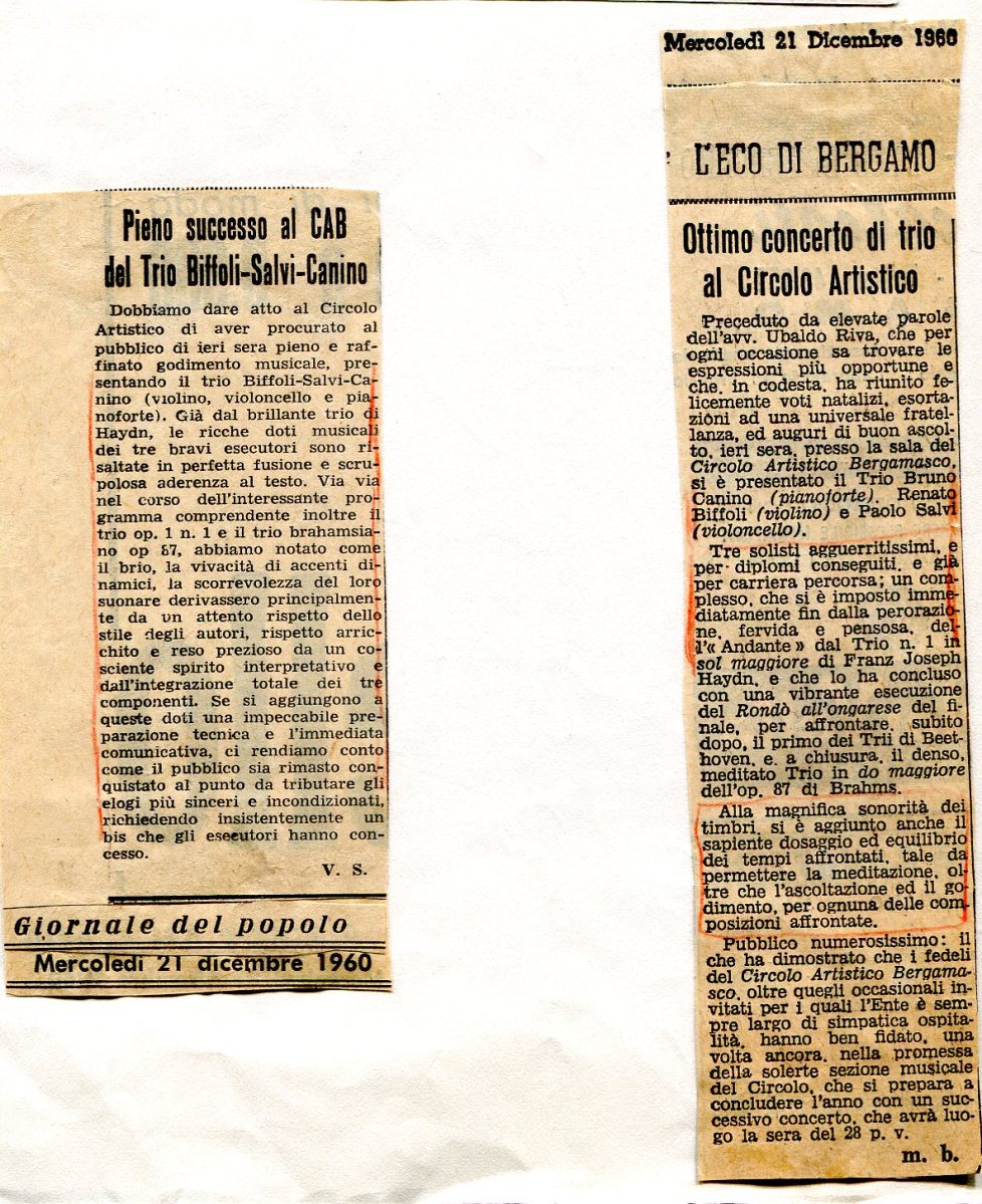 Bergamo 21 Dicembre 1960. Al Circolo Artistico Bergamasco, Biffoli, Salvi e Canino hanno suonato con raffinato tecnicismo musiche di F. J. Haydn e di Beethoven. La perfetta aderenza al testo ed il rispetto per lo stile di ogni autore interpretato è caratteristica comune ad ogni componente del Trio. A conclusione della serata è stato interpretato il Trio in Do Maggiore op. 87 di Brahms, ricco di brio, di vivacità di accenti dinamici. Il pubblico ha elogiato i Maestri ed ha richiesto a gra voce un bis: non poteva accettare che la musica fosse finita.