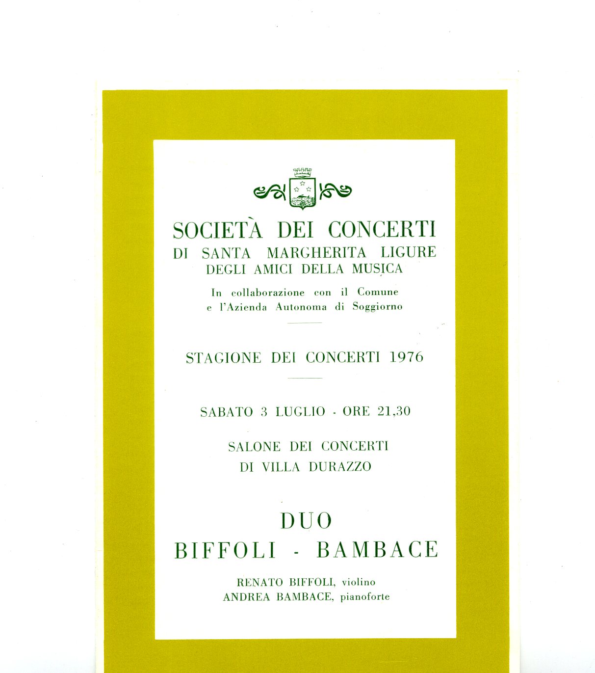 Nel Salone dei concerti di Villa Durazzo i Maestri Renato Biffoli (violino) ed Andrea Bambace (pianoforte) hanno eseguito musiche di W. A. Mozart, L. V. Beethoven L. Dallapiccola, F. Mendelssohn. Santa Margherita Ligure, 3 Luglio 1976.